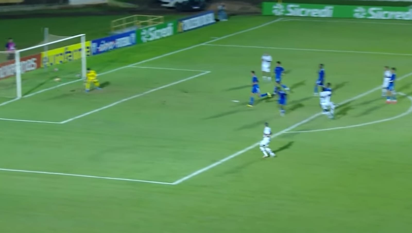 Aos 40 minutos, Samuel acompanha o ataque tricolor e recebe a bola no interior da grande área e girando o corpo finaliza a esquerda de Kauê. Grande chance de empate perdida pelo São Paulo.